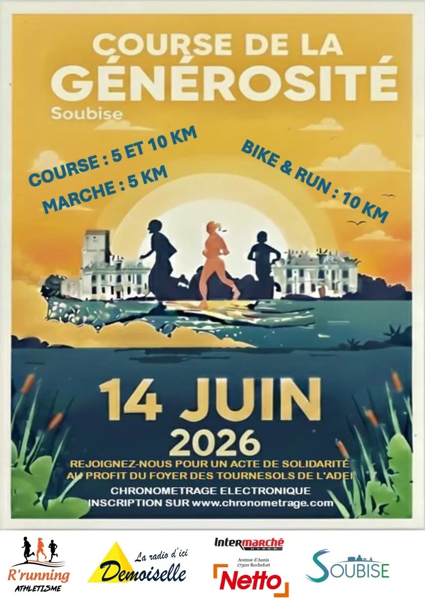 Pour sa 19e édition, la Course de la générosité revient au profit du foyer des Tournesols de l'ADEI à Soubise. Rejoignez le R'running sur l'une des 4 épreuves proposées afin de récolter des fonds pour une bonne cause !
