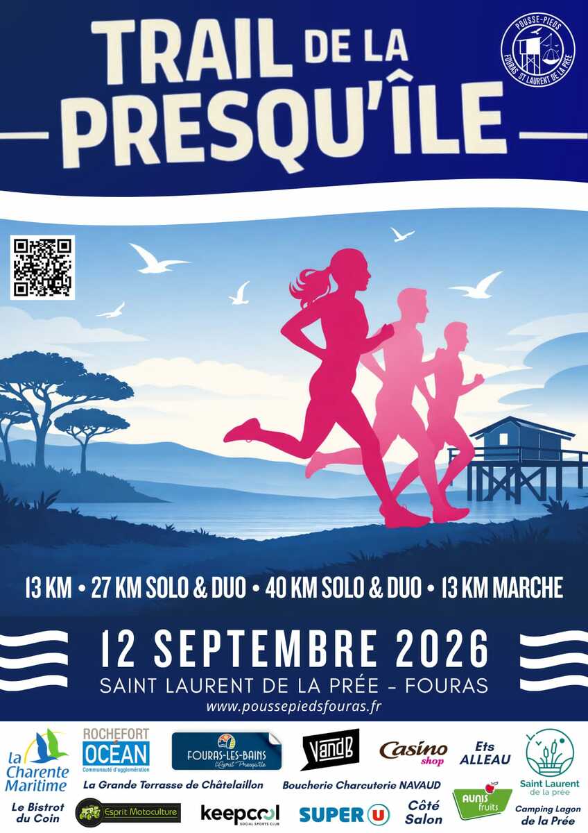 Pour la 3e édition du Trail de la Presqu'île, l'association des Pousse-Pieds vous propose 3 parcours trail ainsi qu'une marche entre Saint-Laurent-de-la-Prée et Fouras, au coeur de l'estuaire de la Charente. Pour joindre l'utile à l'agréable, les Pousse-Pieds vous invitent à faire un don au profit de la reconstruction de Fort Boyard lors de l'inscription.